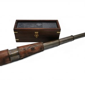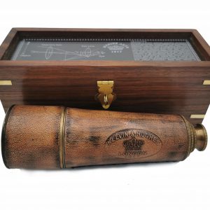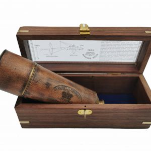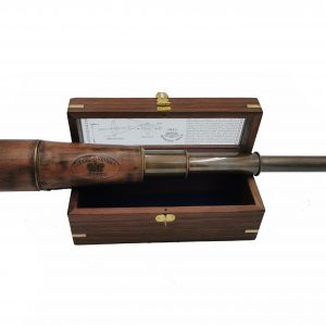 El catalejo surgió entre los siglos XVI y XVII. Su iniciativa es atribuida al holandés Hans Lippershey. En sus primeros tiempos fue utilizado principalmente por marinos y naturalistas. Reproducción de un catalejo de cuatro tubos, recubierto de cuero, en latón envejecido.