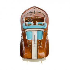 Lancha motora: Maqueta inspirada de los Runabouts italianos. Símbolo de lujo, estas magníficas lanchas de deporte se hicieron muy famosas en los años 60. Estaban construidas de madera de caoba barnizada, accesorios cromados y asientos de cuero. Esta miniatura naval está elaborada artesanalmente a partir de una selección de diferentes láminas de maderas nobles ensambladas una a una y a las que se les aplicará numerosas capas de barníz hasta conseguir el característico efecto “espejo”. Embalaje en caja individual.