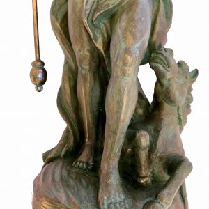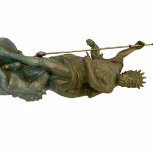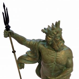 Figura de Neptuno 28×14,5x9cm; Reproducción de una figurina inspirada de Neptuno. Para los latinos era la deidad de la humedad, el dios romano del mar, de la navegación, de los ríos, las islas, tormentas y protector de los caballos. Según la leyenda, su tridente, le permitía levantar o calmar las aguas. Realizada en resina y pintada a mano, patinada acabado bronce.