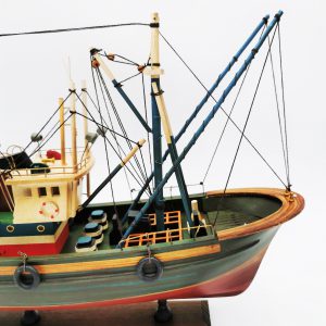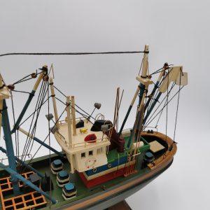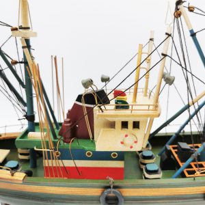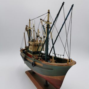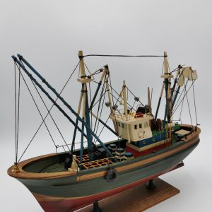 Pesquero del norte originalmente concebido para la pesca del atún. Su principal característica es su proa elevada que le protege del fuerte oleaje del mar. Maqueta decorativa artesanal realizada en madera. La patina le da un aspecto antiguo. Embalaje : Barco montado entregado en caja individual.
